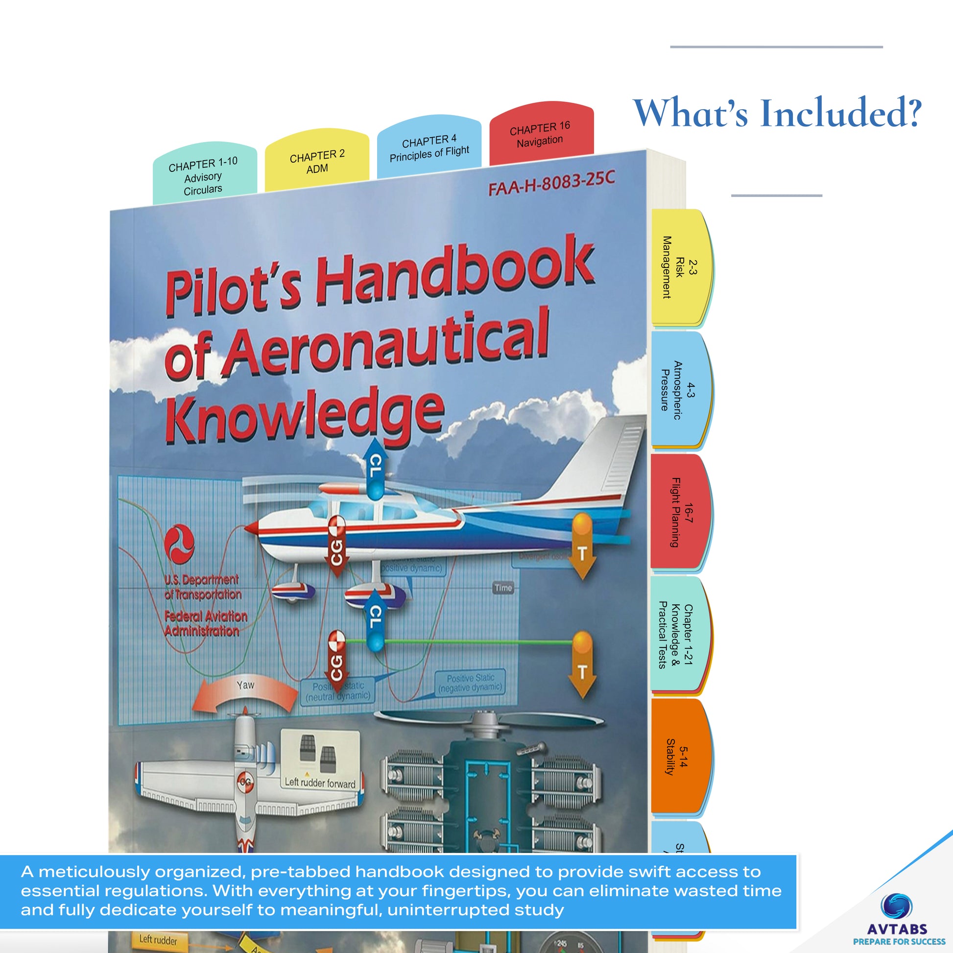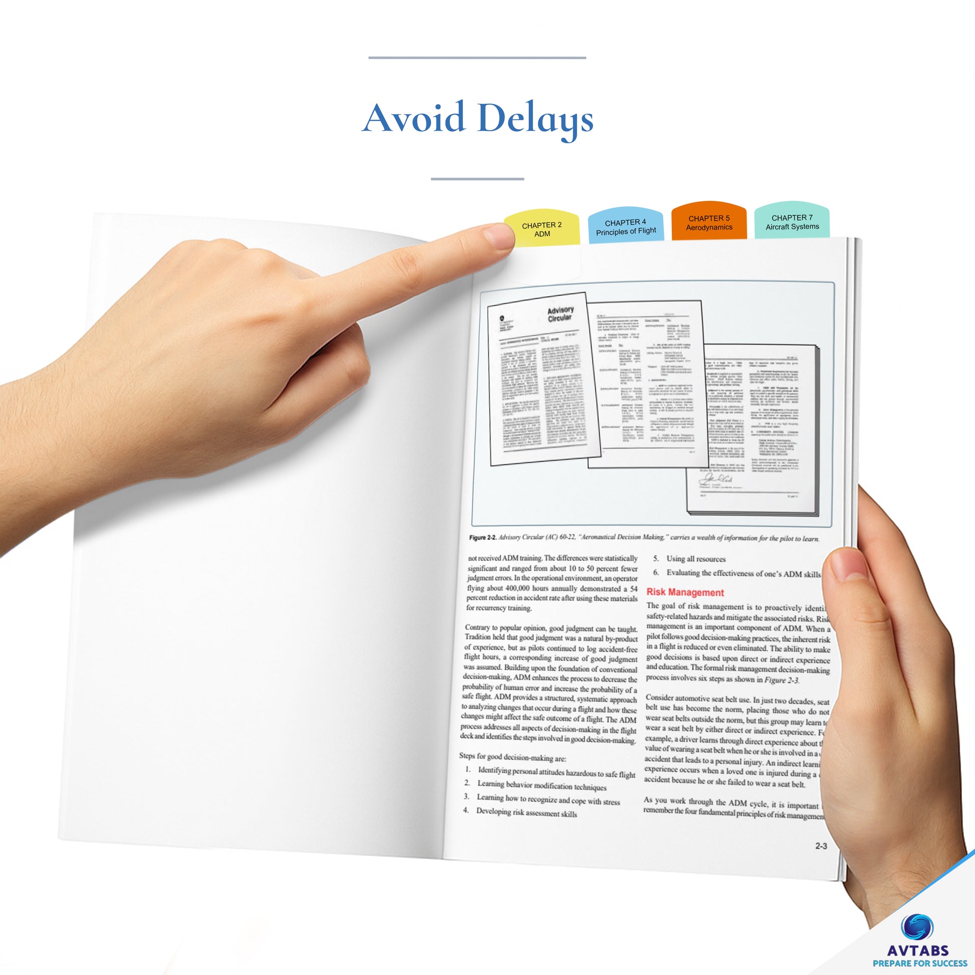 AvTabs provide color-coded and pre-labeled tabs that make finding key information within aviation handbooks faster and easier. This helps streamline study sessions, reduces the time spent flipping through pages, and allows pilots and instructors to focus on important content.